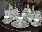 Savour life, one gift at a time... | From the Blue Room, come see our antique patterned glass Canadian Goblets and Bearington bears | | Also from the Blue Room, a beautiful Rose Brocade Prcelain China in blue and white | | Just wait 'til you come through the Sage Room! You'll find a corner china cabinet with chintz china pieces, antique china and the popular "Royal Albert" pieces. | | "Morning Glory" porcelain china displayed on plum coloured organdy table topper - Yours to see in the "Lilac Room" | | "Cream Lace" and "Nostalgia" porcelain china displayed on anantique table and faux apple cake on pedestal cake plate - Come see this exquisite setting in the "Gathering Room |